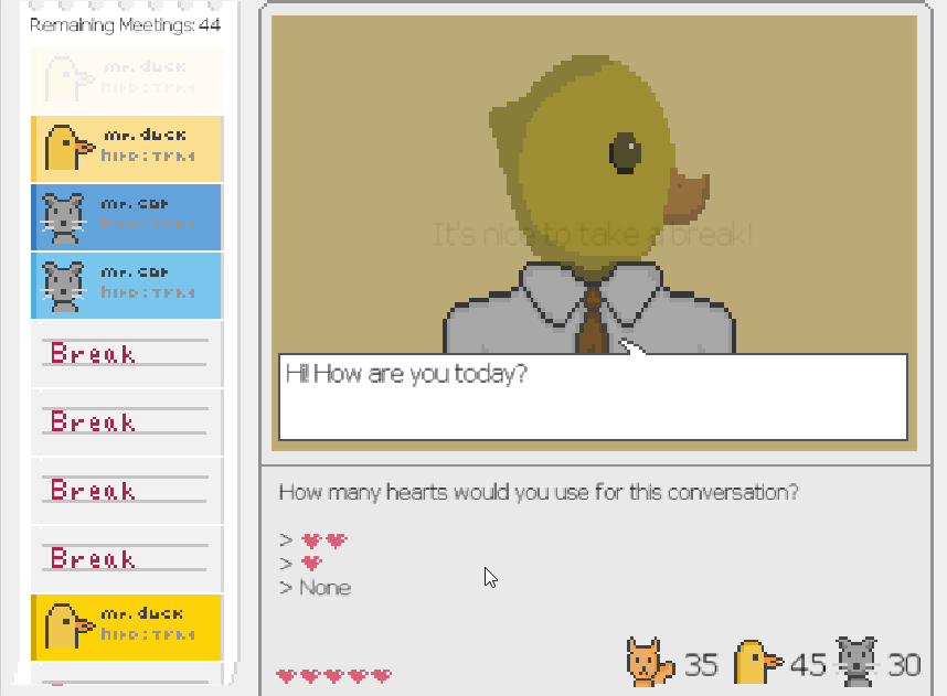 A decision-making game about social anxiety and zoom fatigue. The experience of finding someone worth giving your heart to, but realizing you've already exhausted your capacity to care. [itch] [Ludum Dare]