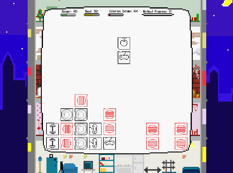 A weight losing simulator with puzzle fighter like mechanism. Your goal is to finish a workout plan before you consume too much calories. The key is to keep your food and your mind clean! [itch] [Ludum Dare]
